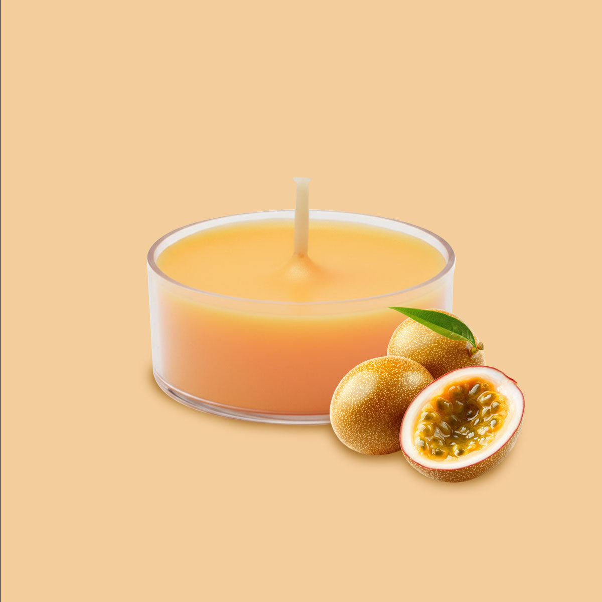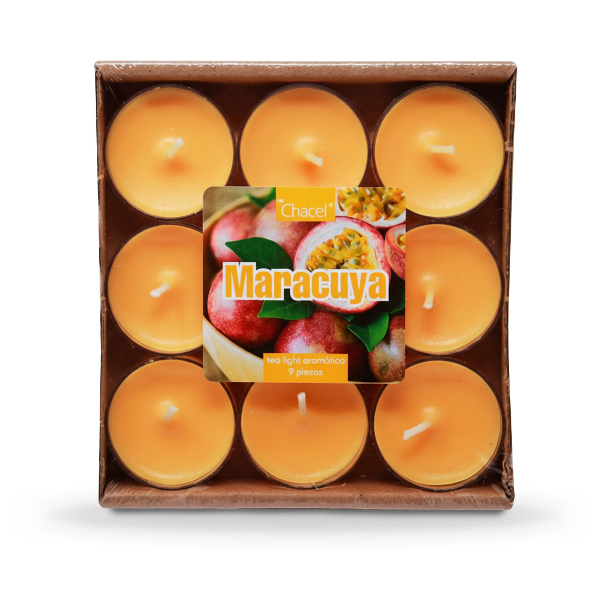 Características * Aroma: Maracuyá * Tipo de Producto: Tea Light o Vela de Té Aromática - Caja con 9 piezas * Dimensiones Caja: 12,2 X 13 cm * Peso: 90 g (10 g cada una) * Duración: Hasta 3.5 horas de fragancia continua (por Tea Light) * Pabilo de algodón de alta calidad, libre de plomo * Ingredientes: Mezcla de ceras naturales. Producto vegano, libre de humo y ollin. * Artesanal: Cada vela está vaciada y empaquetada a mano, con atencion al detalle para asegurar calidad y excelencia.