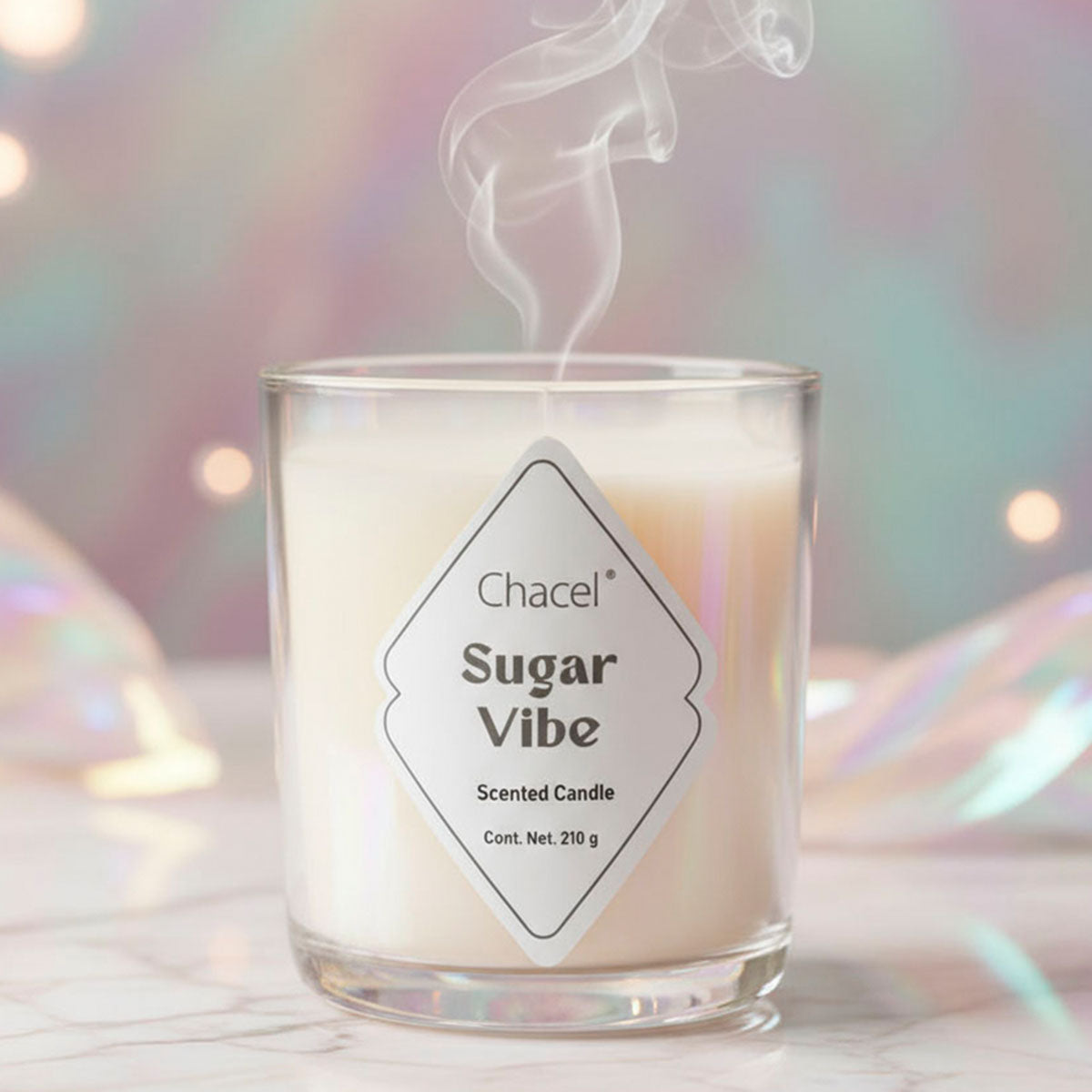 Características * Aroma: Vibra de azúcar * Tipo de Producto: Vela Aromática Chica - Color transparente tornasol * Dimensiones: 8 X 9 X 8 cm * Peso: 210 g * Duración: Hasta 42 horas de fragancia continua. * Pabilo de algodón de alta calidad, libre de plomo * Ingredientes: Mezcla de ceras naturales. Producto vegano, libre de humo y ollin. * Artesanal: Cada vela está vaciada y empaquetada a mano, con atención al detalle para asegurar calidad y excelencia.