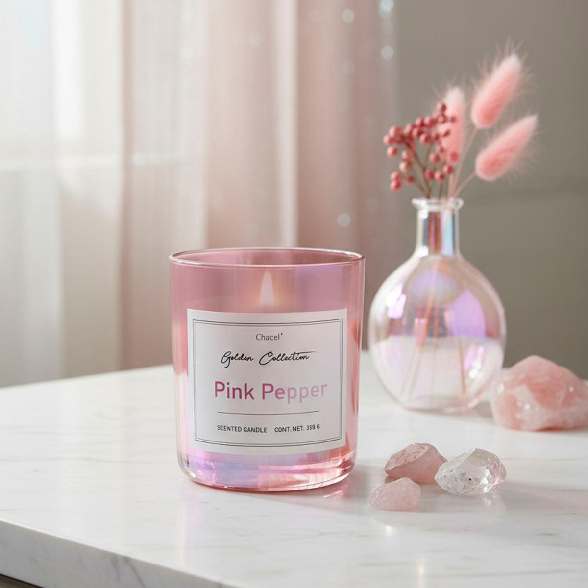 Características * Aroma: Pimienta rosa * Tipo de Producto: Vela Aromática Mediana - Color rosa metálico * Dimensiones: 8,5 X 10 X 8,5 cm * Peso: 320 g * Duración: Hasta 64 horas de fragancia continua * Pabilo de algodón de alta calidad, libre de plomo * Ingredientes: Mezcla de ceras naturales. Producto vegano, libre de humo y ollin. * Artesanal: Cada vela está vaciada y empaquetada a mano, con atención al detalle para asegurar calidad y excelencia.