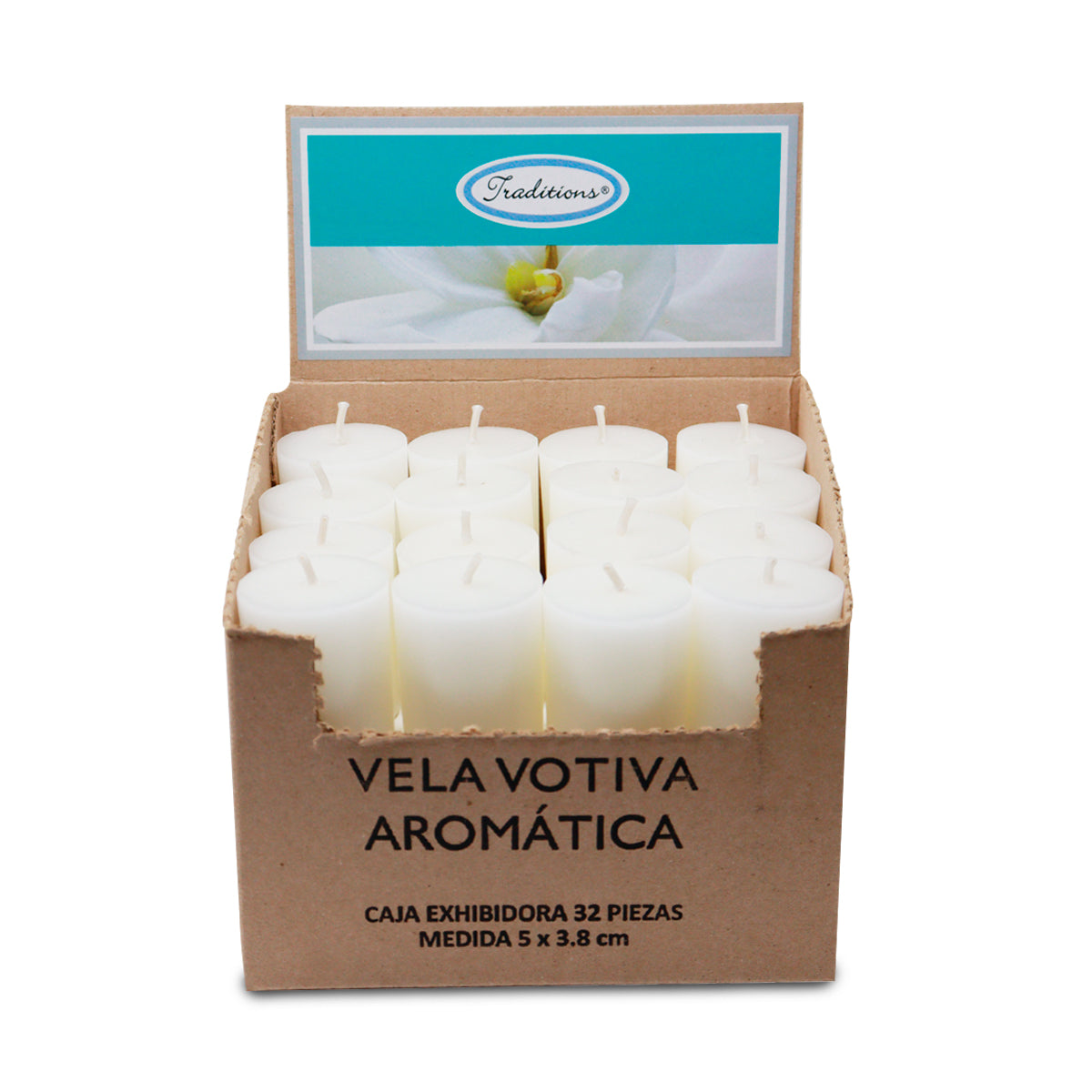 Características * Aroma: Gardenia * Tipo de Producto: Vela Votiva Aromática - Caja con 32 piezas * Dimensiones Pieza: 3.8 X 5 cm - Caja: 15 X 11 X 15 cm * Peso Pieza: 45 g - Caja: 1,6 kg * Duración: Hasta 10 horas de fragancia continua (por Vela) * Pabilo de algodón de alta calidad, libre de plomo * Ingredientes: Mezcla de ceras naturales. Producto vegano, libre de humo y ollin. * Artesanal: Cada vela está vaciada y empaquetada a mano, con atención al detalle para asegurar calidad y excelencia.